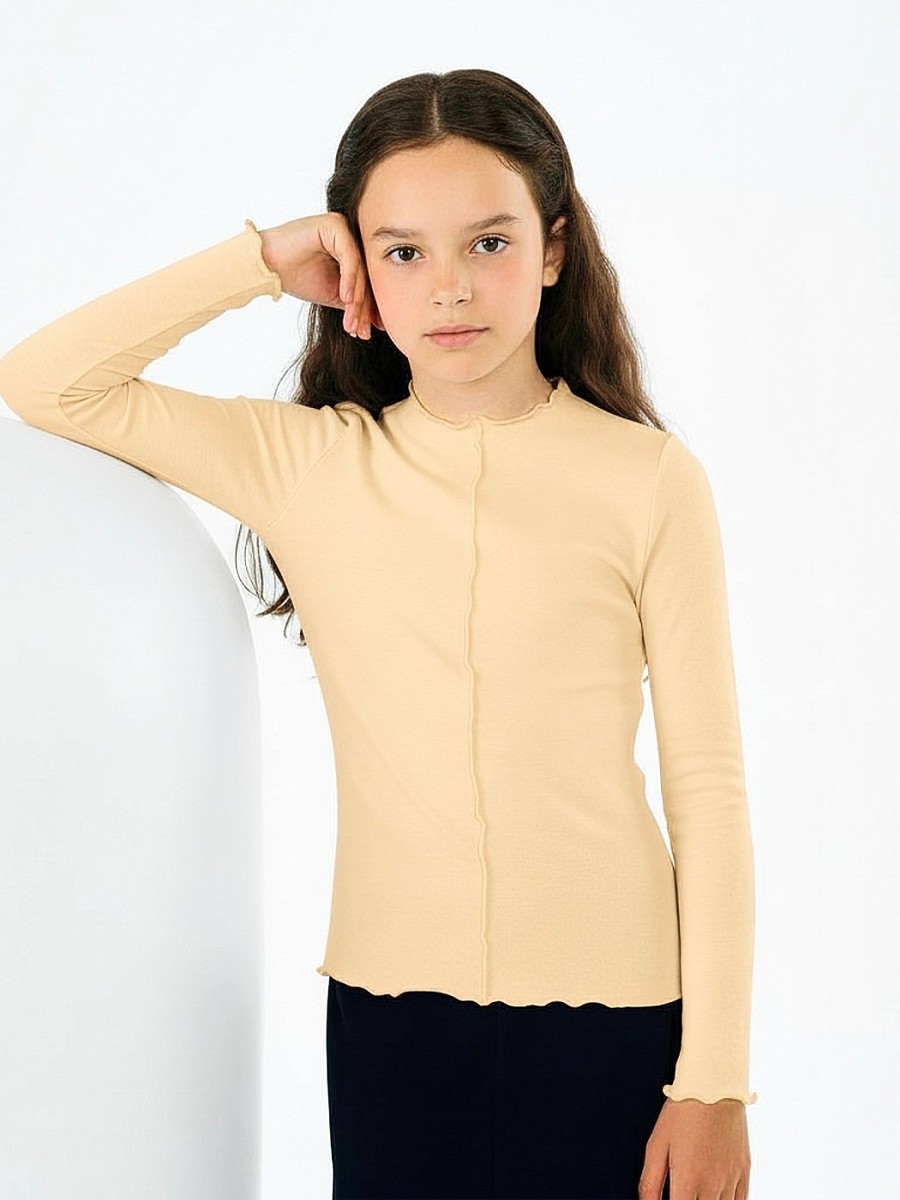 Замечательная школьная блуза для девочки, изготовленная из тонкого материала - рибаны. Спереди и на плечиках швы выполнены наружу. Модель украшают волнистые края по вороту, рукавах и по низу изделия.