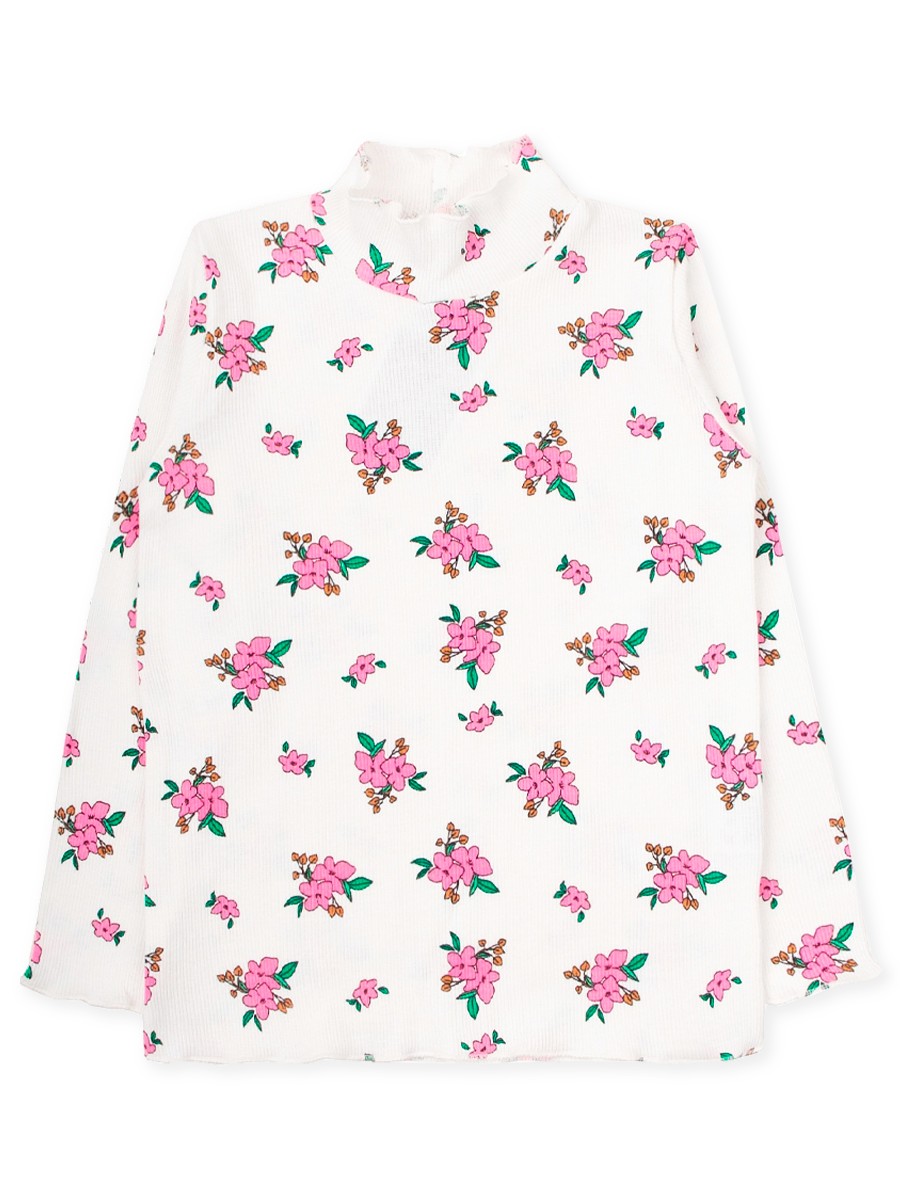 Хорошенькая водолазка для девочки с симпатичным набивным рисунком. По вороту, рукавах и по низу изделия - волнистые края. Материал водолазки - кашкорсе, отлично тянется.