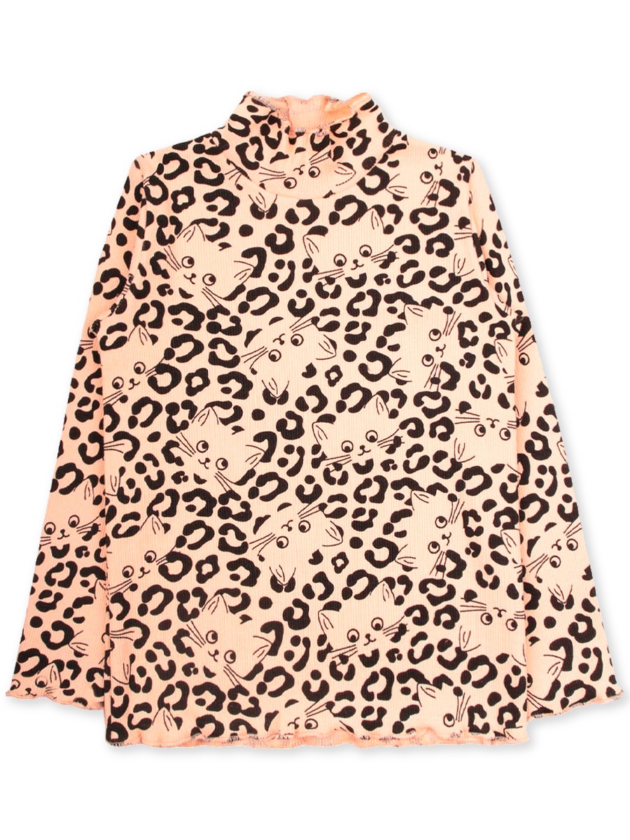 Хорошенькая водолазка для девочки с симпатичным набивным рисунком. По вороту, рукавах и по низу изделия - волнистые края. Материал водолазки - кашкорсе, отлично тянется.