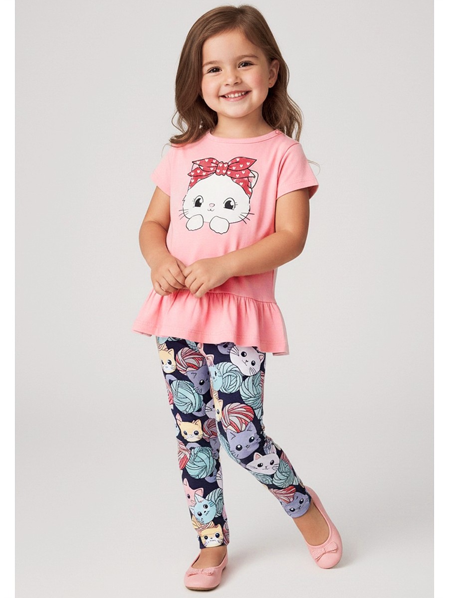 Симпатичный комплект для девочки, состоящий из туники и лосин. Туника на одном плечике застёгивается на кнопочку. По низу изделия имеется широкий волан. Модель украшает чудесный принт на полочке. Лосины на удобной мягкой резинке в красивый набивной рисунок. Комплект выполнен из тонкого эластичного хлопка - кулирки с добавлением полиэстера.
