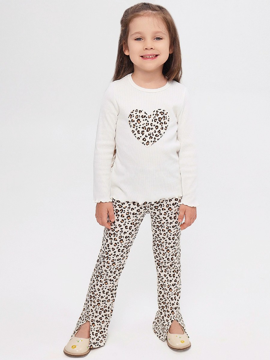 Симпатичный костюм для девочки, состоящий из кофты и брюк. На рукавах и по низу кофты имеются волнистые края. Модель украшает пришивное сердце на полочке в цвет брюк. Брюки-клёш на удобной мягкой резинке, по низу имеются небольшие разрезы. Изделие украшает симпатичный набивной рисунок. Материал костюма - кашкорсе.