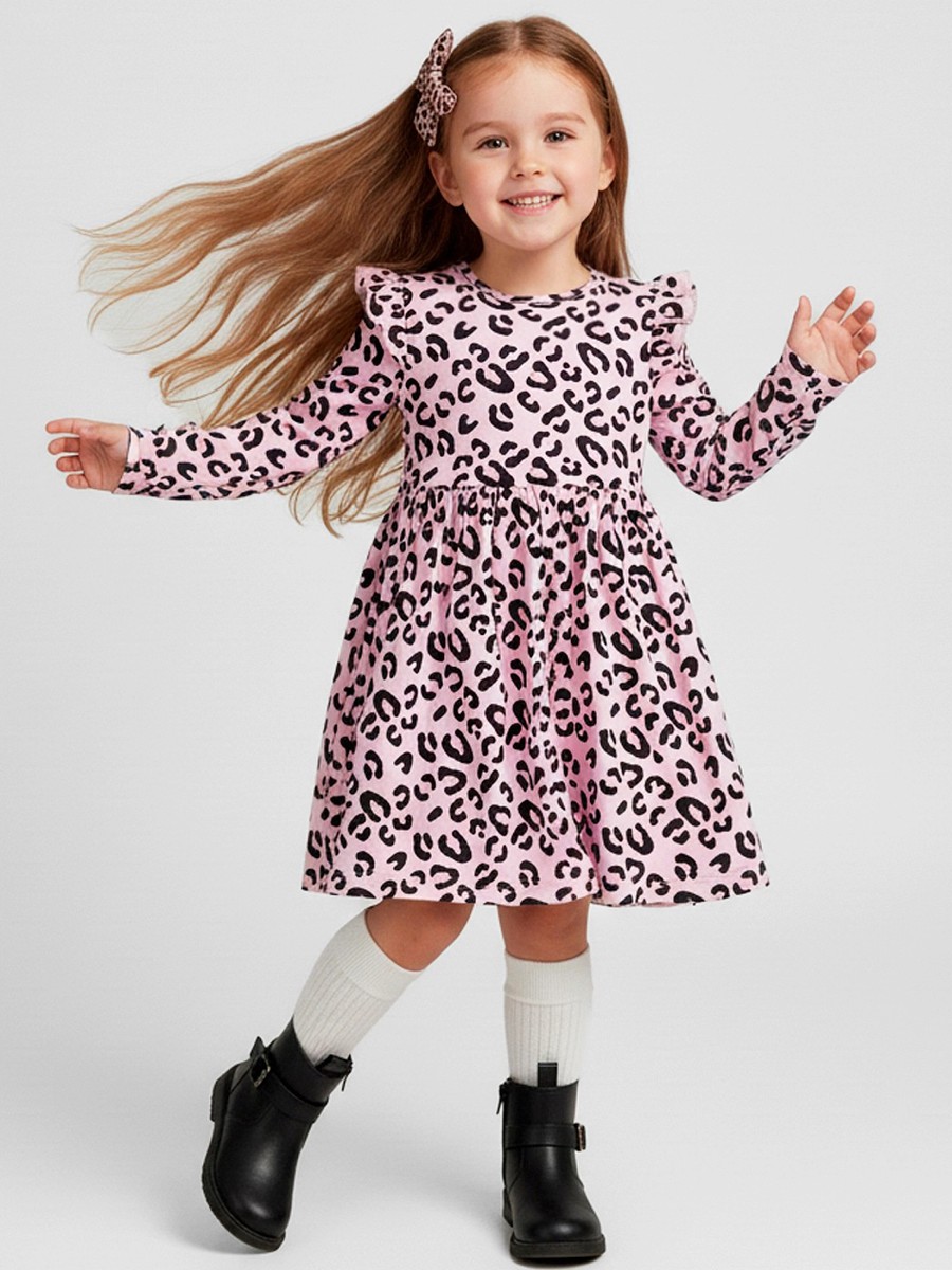 Симпатичное платье для девочки, изготовленное из плотного материала - интерлока. На спинке каплевидный вырез с застёжкой на пуговку, на влечиках имеются декоративные рюши. Модель украшает прелестный набивной рисунок.