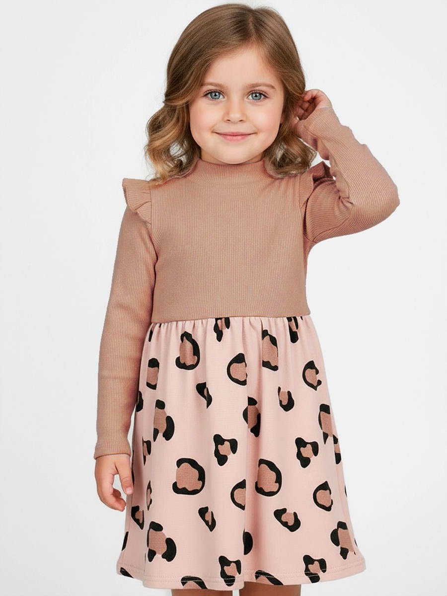 Красивое платье с длинным рукавом для девочки. Воротник-стойка, на плечиках имеются декоравные рюши. Юбка отрезная в сборку, украшена симпатичным набивным рисунком. Верх платья выполнен из кашкорсе, низ - из плотного материала, футера 2-нитки.