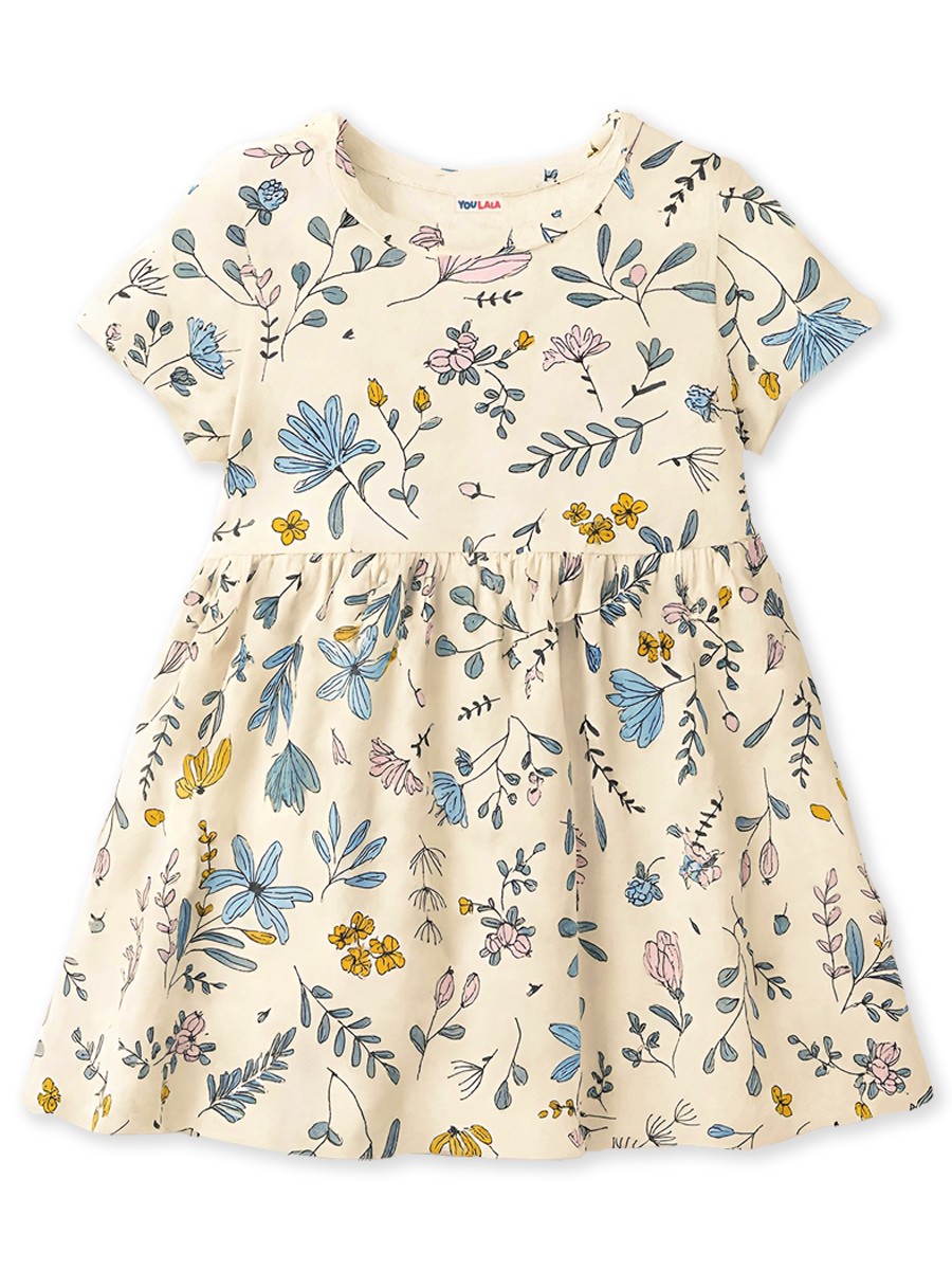 Хорошенькое платье для девочки с коротким рукавом. На одном плече - застёжка на кнопочки. Юбка отрезная в сборку. Модель украшает прелестный набивной рисунок. Платье сшито из 100% хлопка - интерлока.