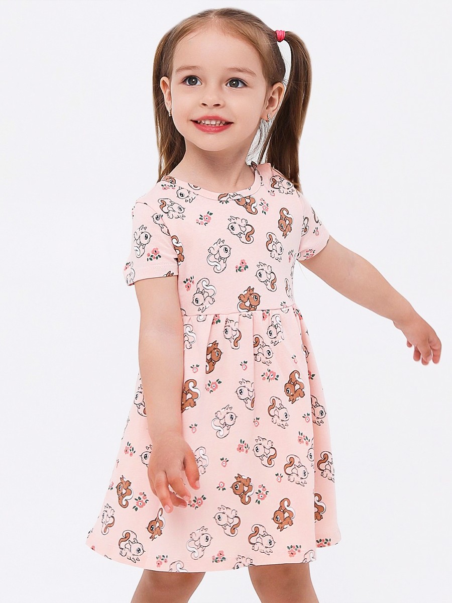 Симпатичное платье для девочки с завышенной линией талии. На одном плечике застёгивается на кнопочки. Модель украшает очаровательный набивной рисунок с белочками. Материал изделия - кулирка.