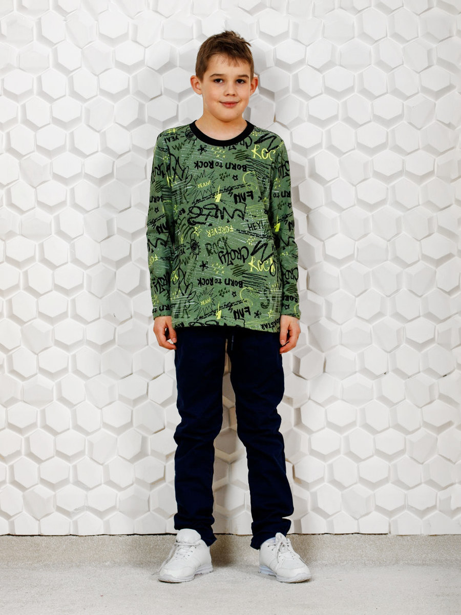 Модный лонгслив для мальчика, изготовленный из 100% хлопка - кулирки. По вороту - мягкая трикотажная манжета. Модель украшает стильный набивной рисунок.