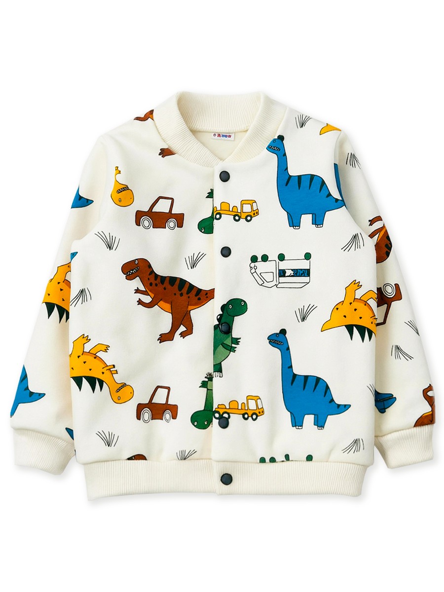 Стильный бомбер для мальчика, выполненный из плотного трикотажа - футера 3-нитки с мягким начёсом внутри. Впереди - застёжка на кнопки, в боковых швах - два внутренних кармана. По вороту, на рукавах и по низу изделия - мягкие трикотажные манжеты. Модель украшает симпатичный набивной рисунок.