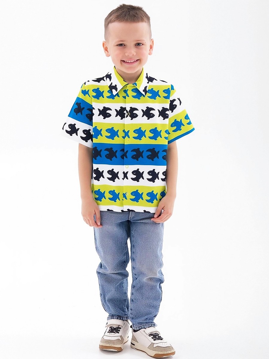Классная рубашка для мальчика, выполненная из 100% хлопка - кулирной глади. Рубашка с коротким рукавом, впереди застёгивается на кнопки. Модель украшает симпатичный набивной рисунок с рыбками.