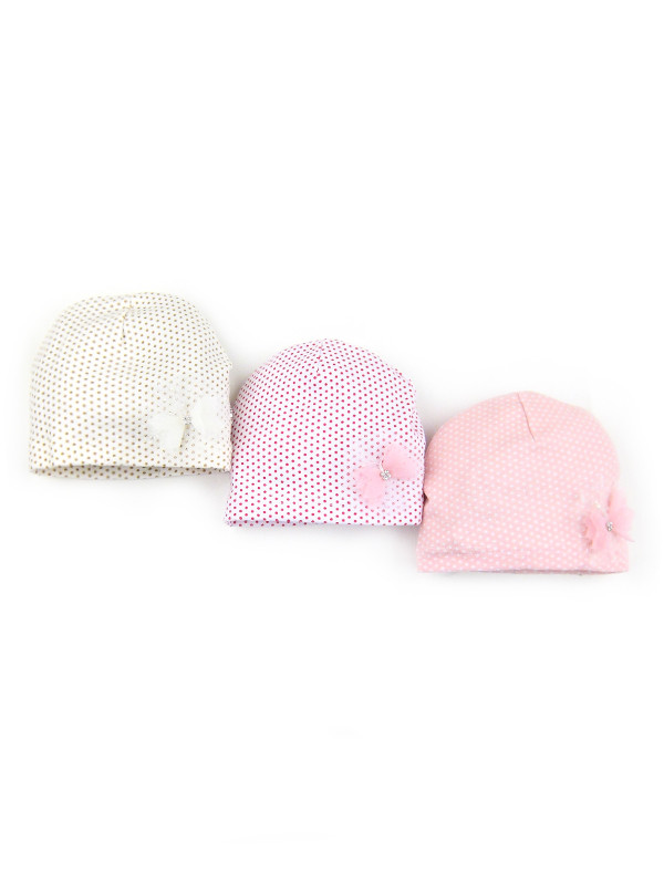 Шапочки для маленьких модниц 7-9 месяцев. Модель шапки классическая. Она однотонная, но разбавлена мелким горошком. Изюминка данной модели - это украшение в виде прелестной бабочки с левой стороны. Обрамляет эту бабочку тонкая, воздушная сеточка. И особую изящность придаёт декору большая крупная страза по самому центру.