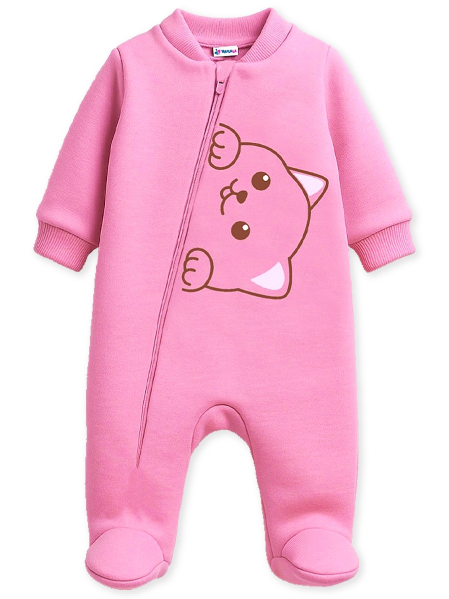Прелестный комбинезон для малышки, изготовленный из плотного теплого материала - футера 3-нитки. Спереди застёгивается на ассиметричную молнию с защитным ярлычком, по вороту и рукавах - мягкие трикотажные манжеты. Модель украшает красивый принт на полочке.