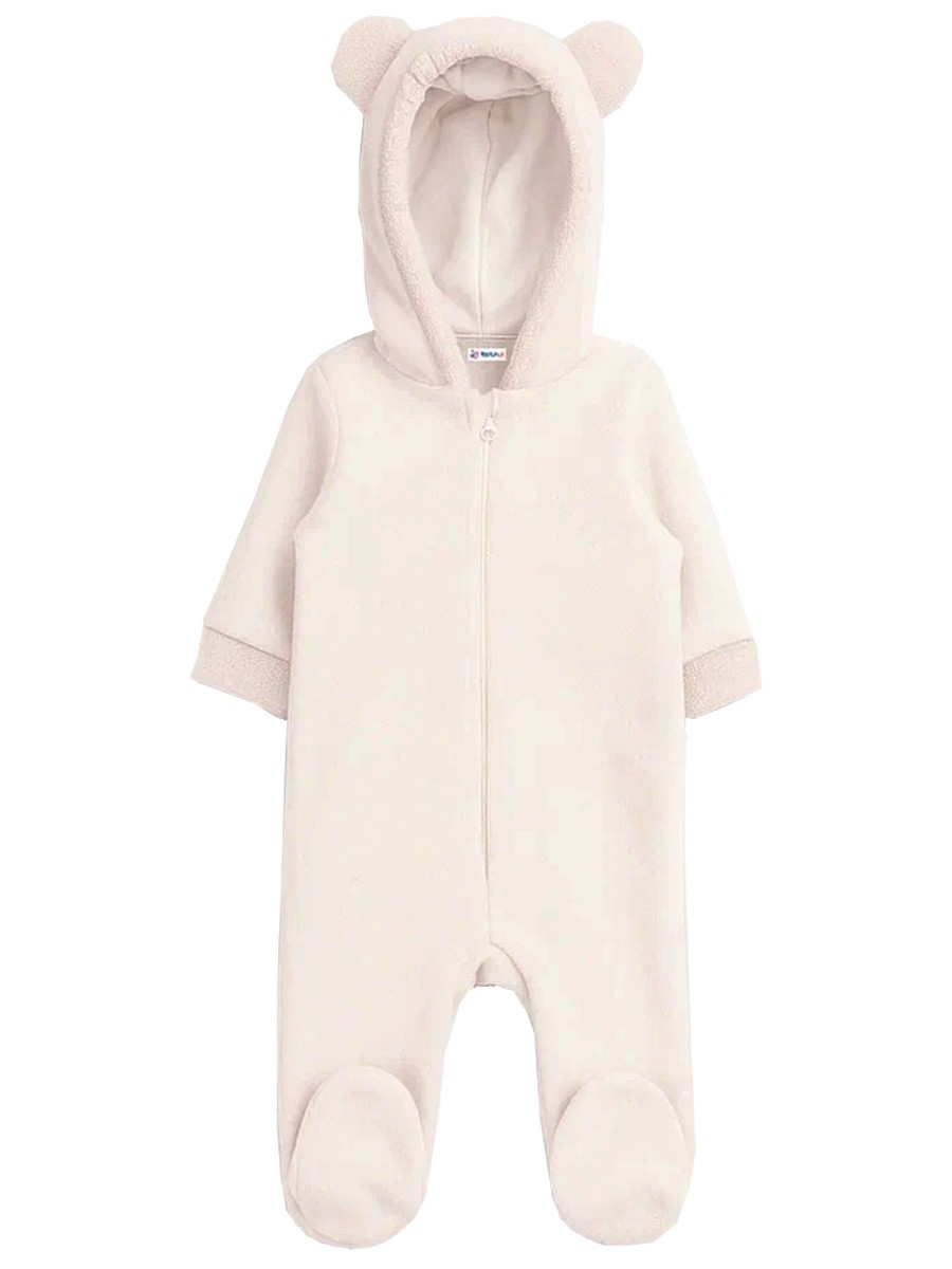 Симпатичный комбинезон для малыша, изготовленный из теплого мягкого материала - флиса. Комбинезон имеет капюшон с резинкой сверху, спереди застёгивается на молнию с защитным ярлычком. Модель украшают пришивные ушки на капюшоне.