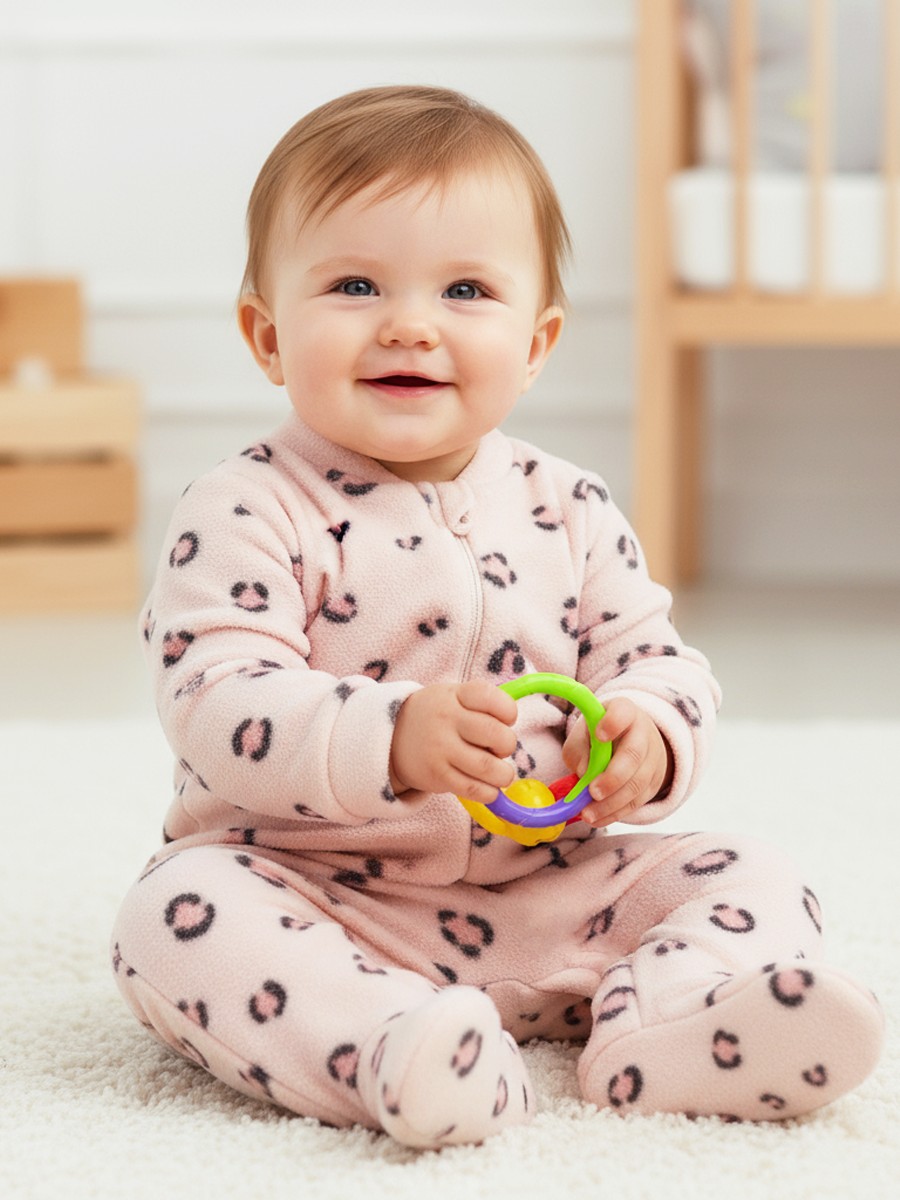 Прелестный уютный комбинезон для малышки с закрытыми ножками, изготовленный из мягкого флиса. Впереди застегивается на молнию с защитным ярлычком. На рукавах имеются мягкие манжеты. Модель украшает симпатичный набивной рисунок.